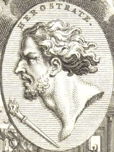 Erostrato fu un fallito della metà del 300 a. C. che per rendersi famoso incendiò e distrusse il celeberrimo tempio di Artemide, una delle sette meraviglie del mondo antico. Lo condannarono a morte e decretarono che non venisse mai ricordato il suo nome, e così fu, nell’antichità.